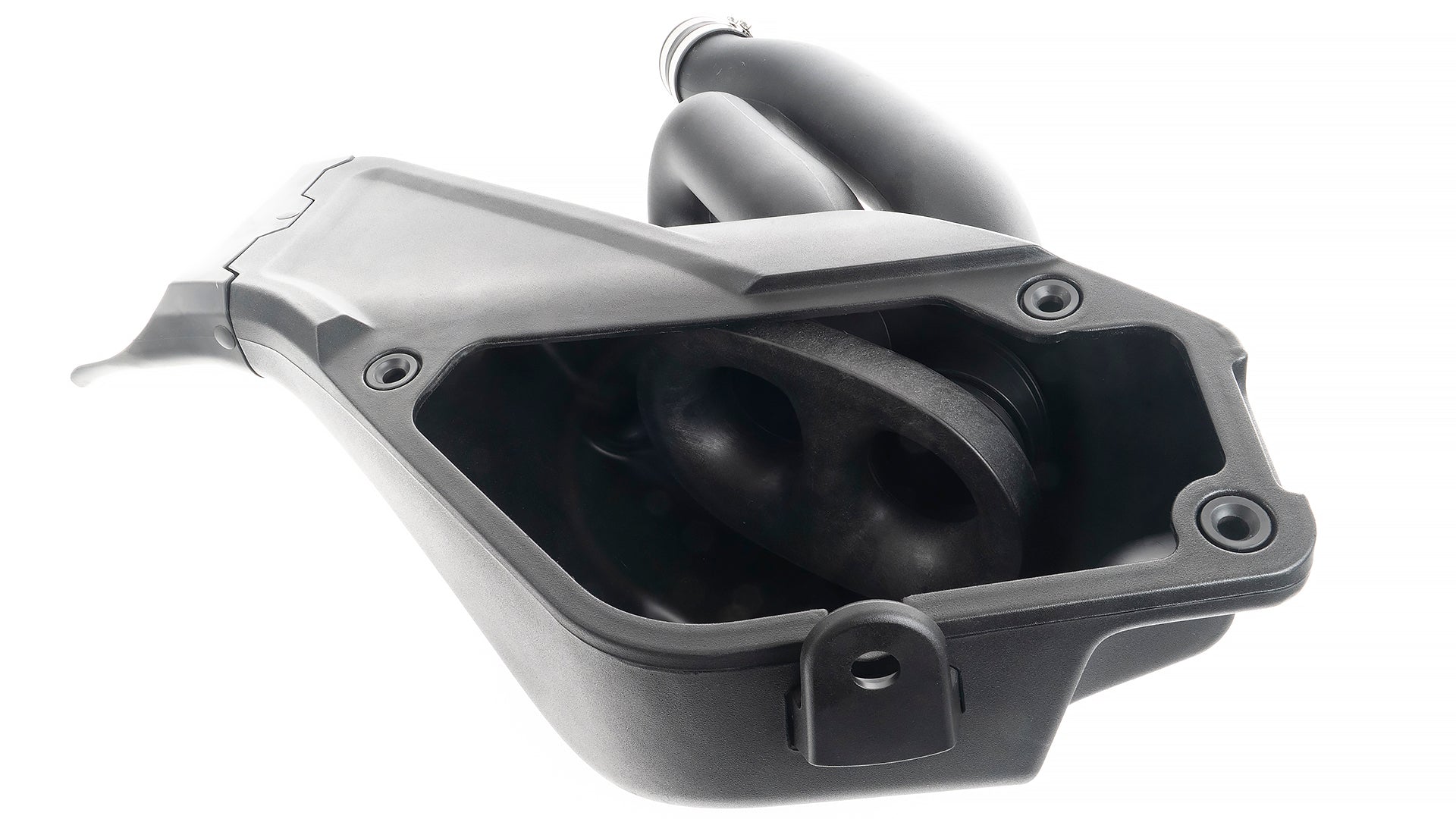 Its true dual design and large filter area with inverted cone deliver perfectly balanced airflow. The bell-mouth design matches the footprint of the filter and splits to deliver air separately to each turbo for maximum performance and throttle response.